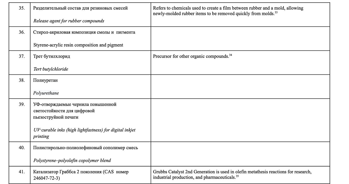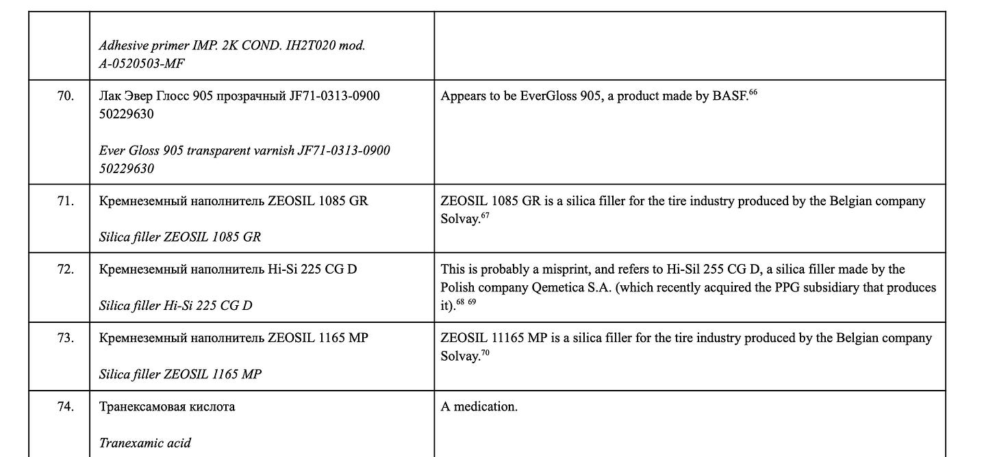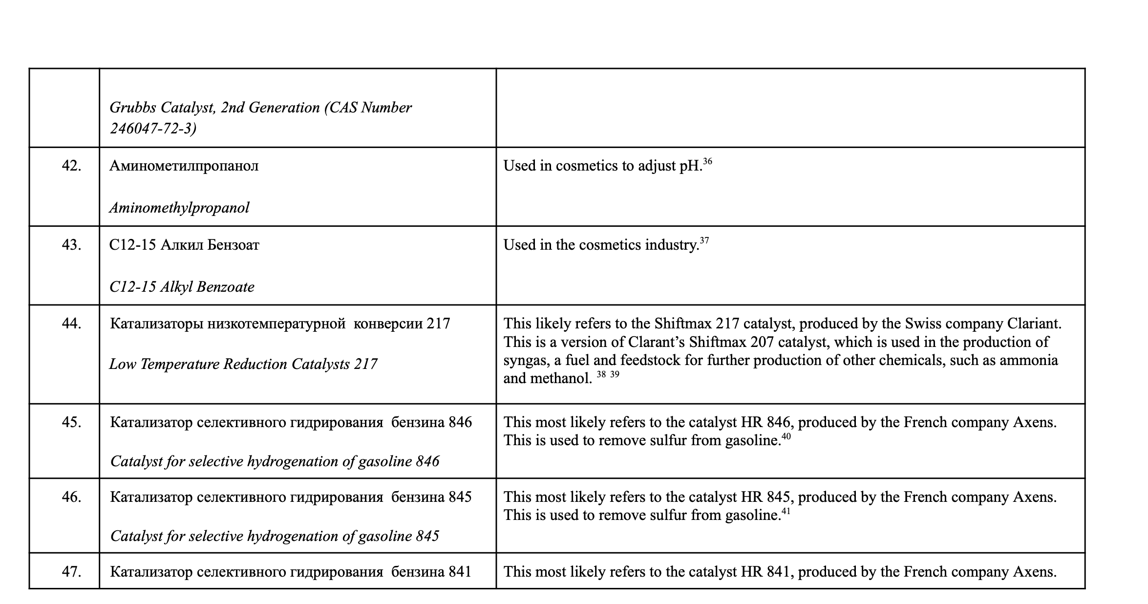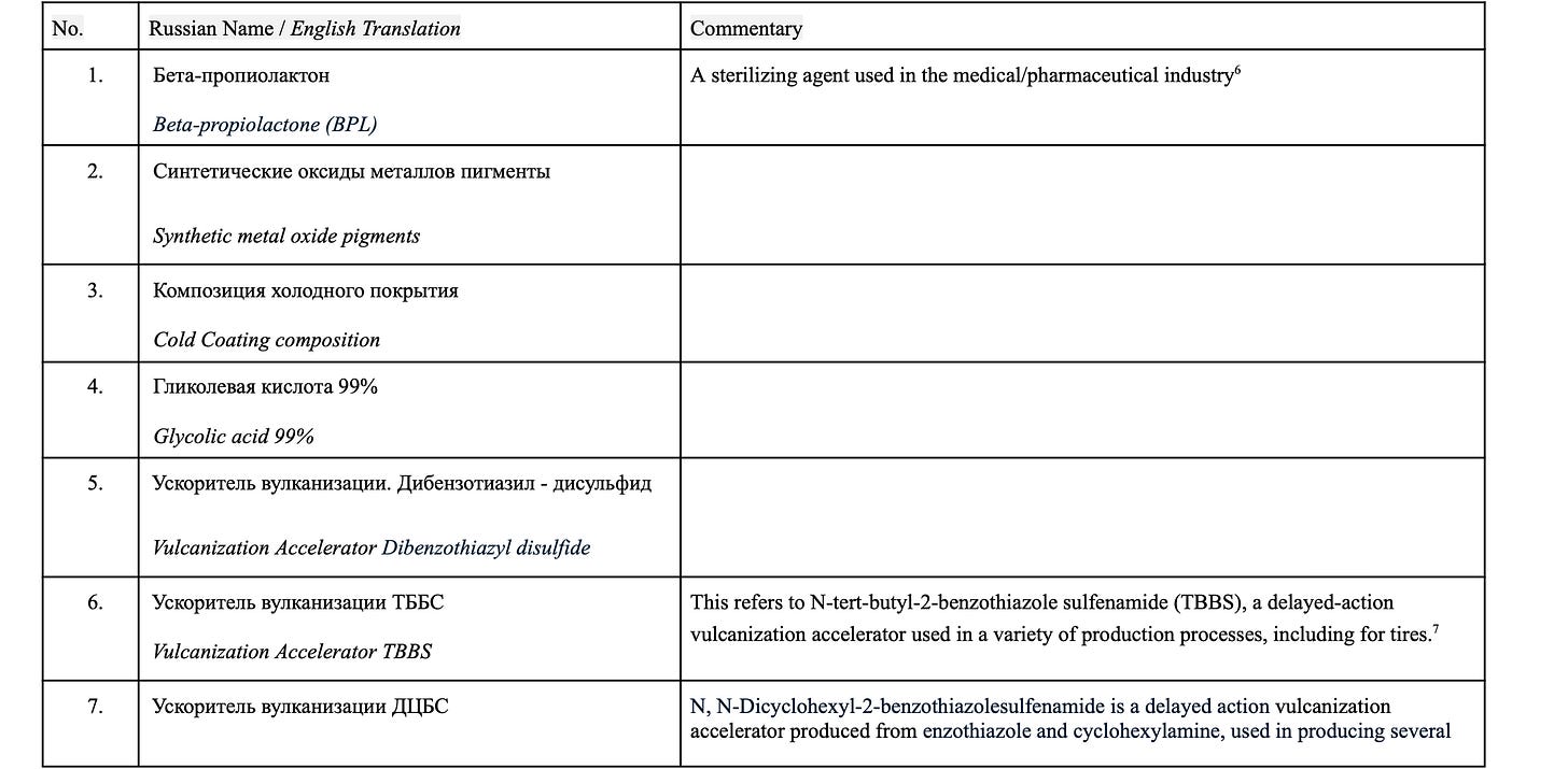 Well, we have that list for you. Screenshots and the full document are below the fold. As I stated in the article, this stuff is weedy. But that does not mean it’s important. The Russian economy cannot function without these chemicals, and it cannot manufacture them internally.