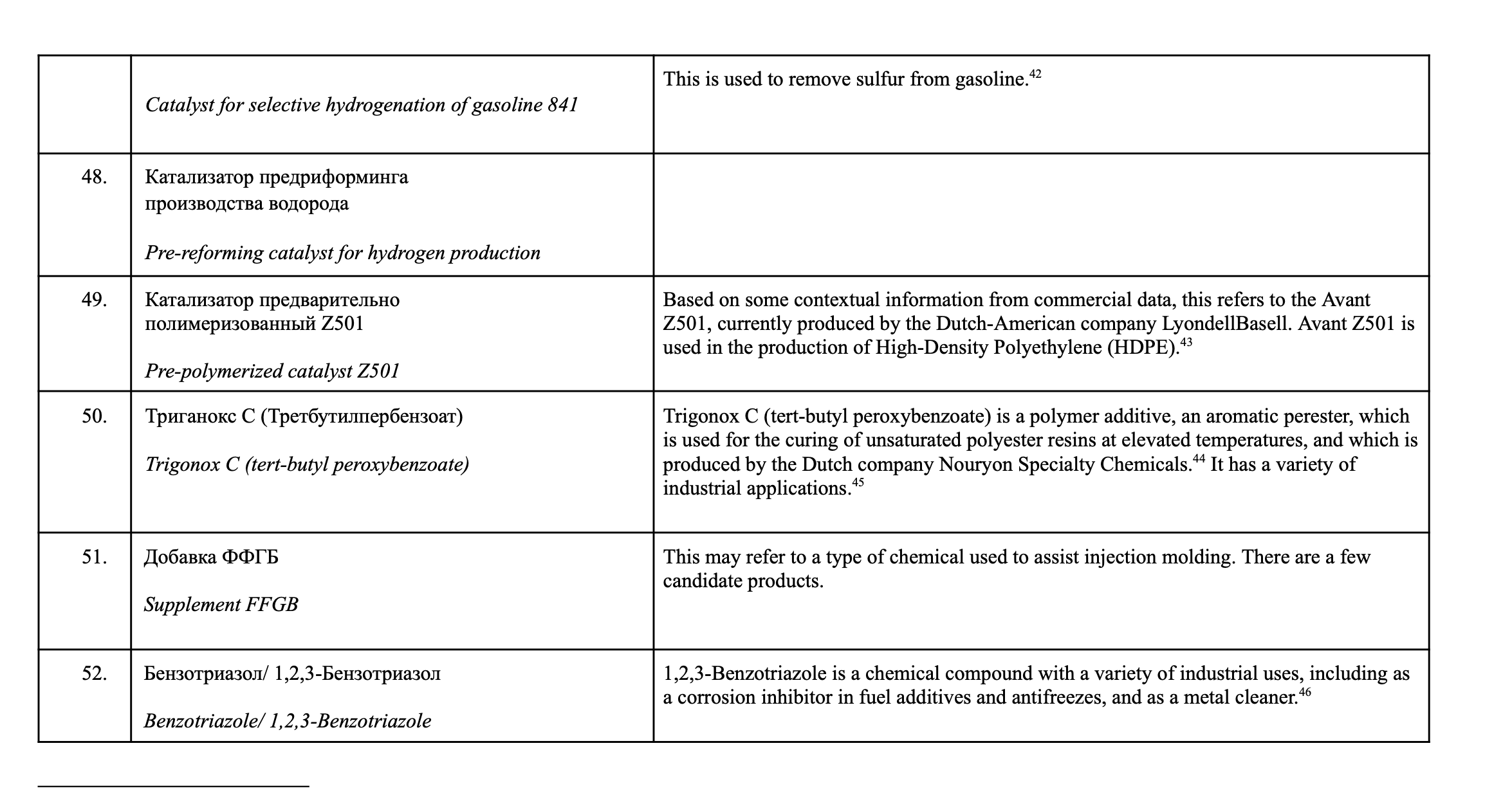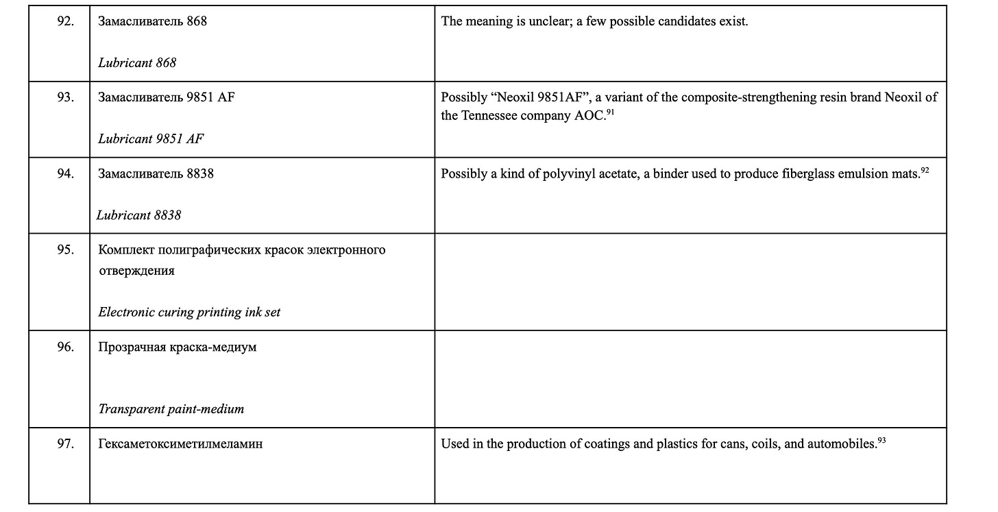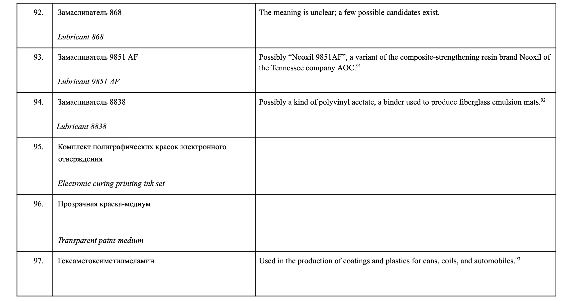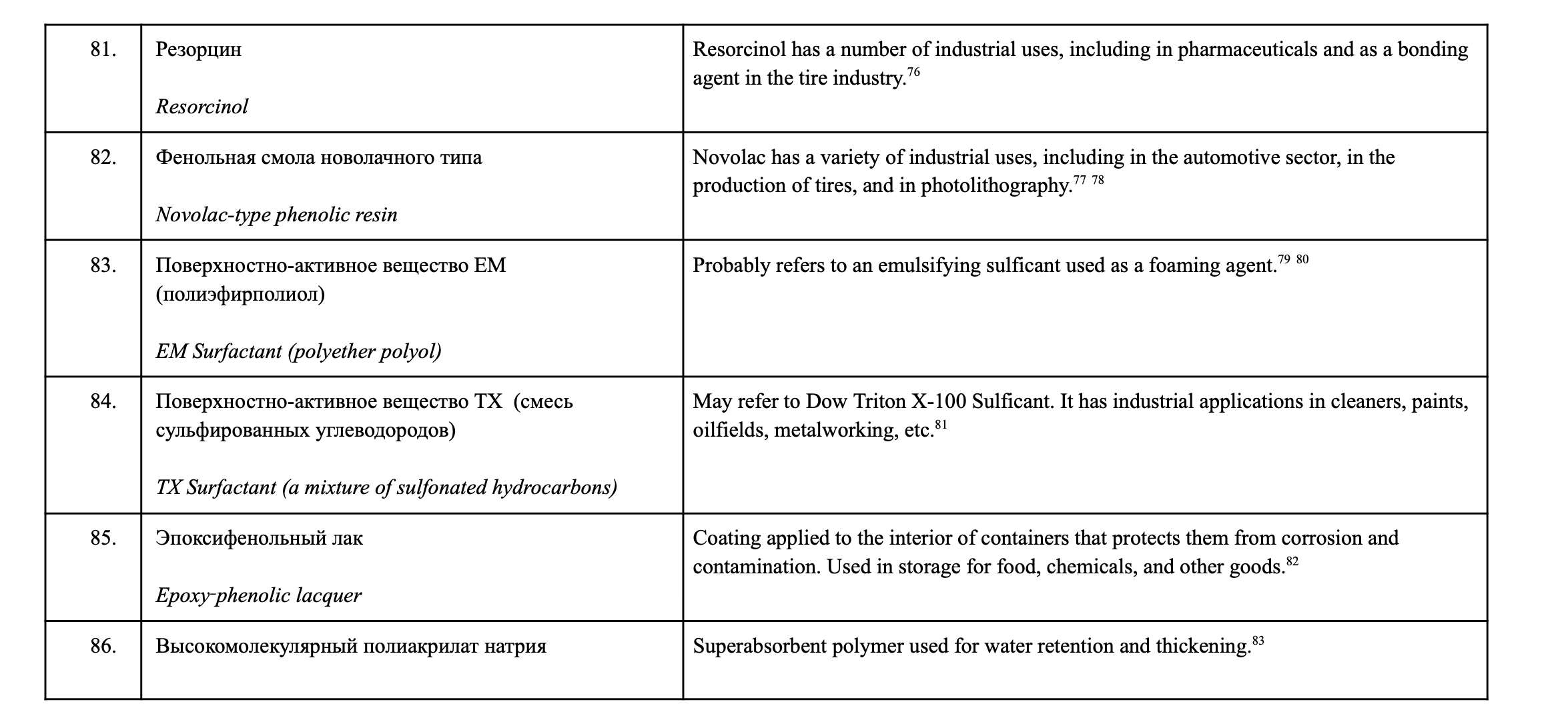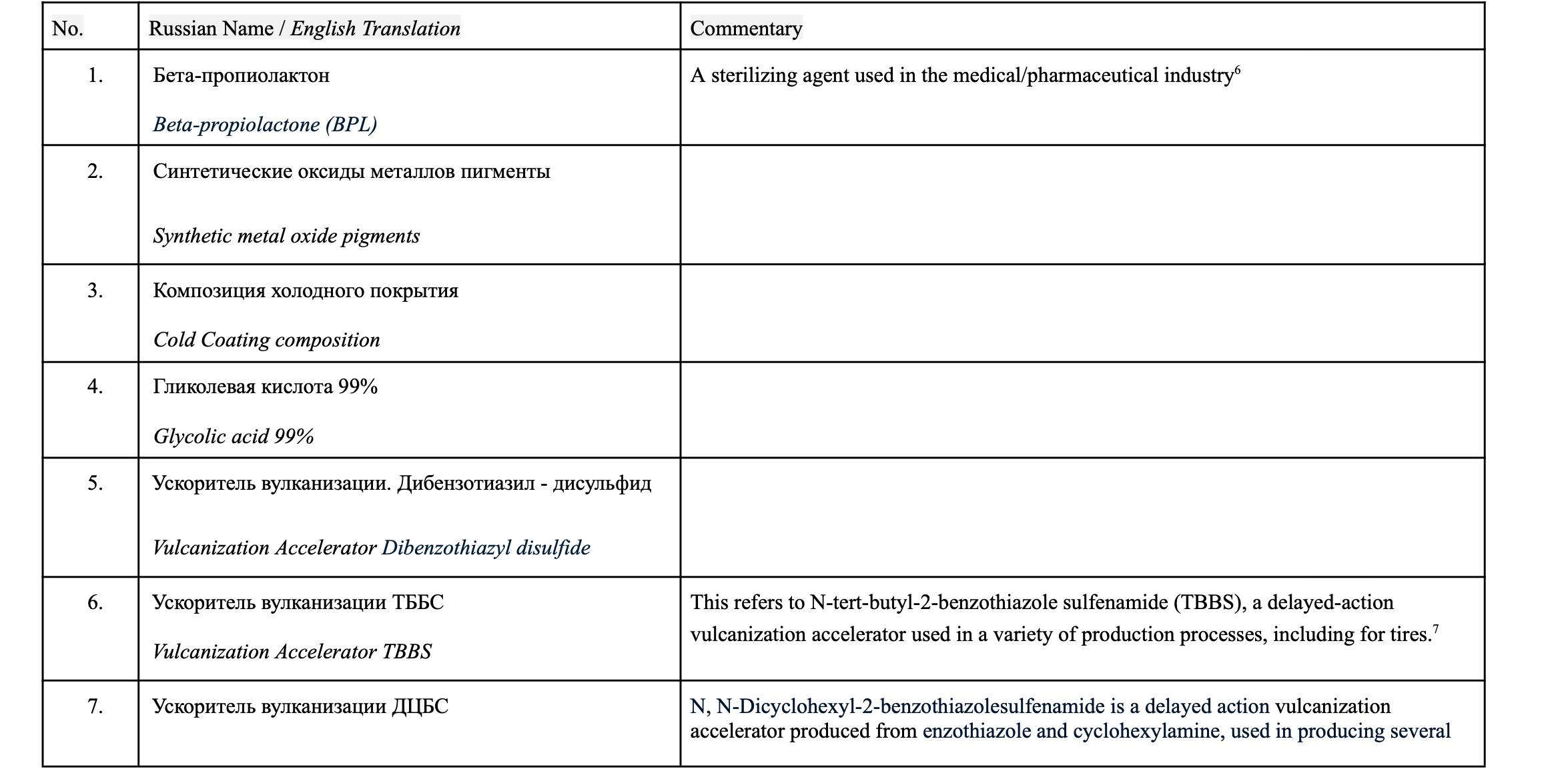 Well, we have that list for you. Screenshots and the full document are below the fold. As I stated in the article, this stuff is weedy. But that does not mean it’s important. The Russian economy cannot function without these chemicals, and it cannot manufacture them internally.